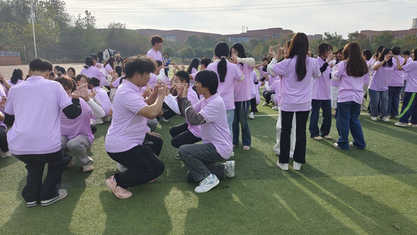 通过“破冰起航”和“团队竞赛”两个环节,同学们敞开心扉、积极活跃,整个现场一片欢腾。在静态热身环节主教练丁飞运用“时空穿梭”这个游戏,让同学们卸下拘束和腼腆,迅速燃起了青春的火力。在动态热身中,同学们在足球场中圈围绕在一起,时而多人抱团,时而转向加速,一首“爱的拥抱”让同学们的状态迅速进入高潮。静态与动态相结合的热身环节给大集体的第一项挑战带来了信心,在丁飞的耐心指导下,同学按照口令“1、2、3、坐!”完成了今天的首次挑战“信任后坐”,全场响起热烈的掌声。