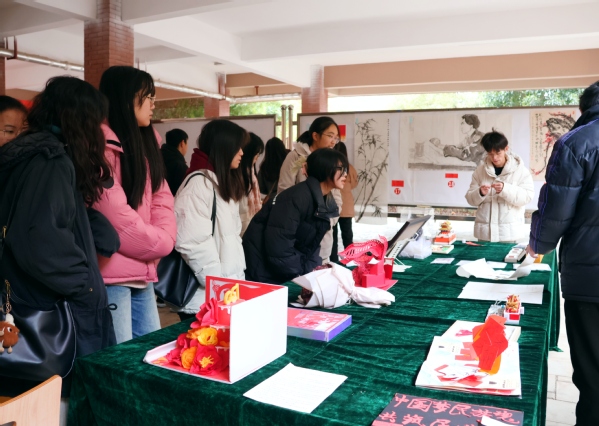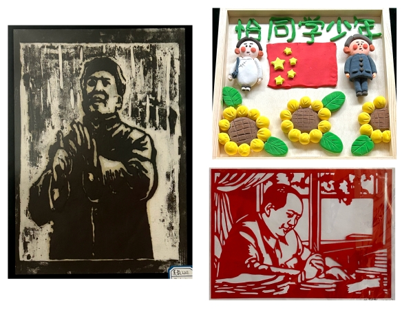 手工艺品形式多样,毛泽东诗句的篆刻印章,积木垒建而成的天安门,刺绣红梅,剪纸《为人民服务》,毛泽东诗词的立体书,流麻作品《开国大典》,无一不彰显着学子对我国民俗文化的喜爱,无一不表现同学们心灵手巧。