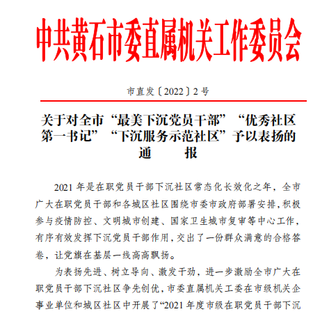 近日,市委直属机关工委下发《关于对全市“最美下沉党员干部”“优秀社区第一书记”“下沉服务示范社区”予以表扬的通报》,欧宝(中国)教育与艺术学部教工党支部书记胡蕾同志荣获“最美下沉党员干部”称号。