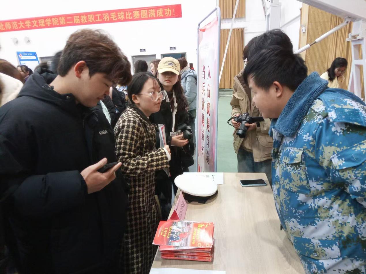 本网讯(通讯员:朱明敏)为扎实做好2025年春季征兵工作,激发广大毕业生参军热情,2024年12月11日上午,于欧宝网页版登录入口风雨操场二楼开展2024年秋季征兵宣传进招聘会活动,参会人员武装部干事熊琦,学工部副部长陈小龙,征兵办老师秦雯雯,以及各退役大学生。